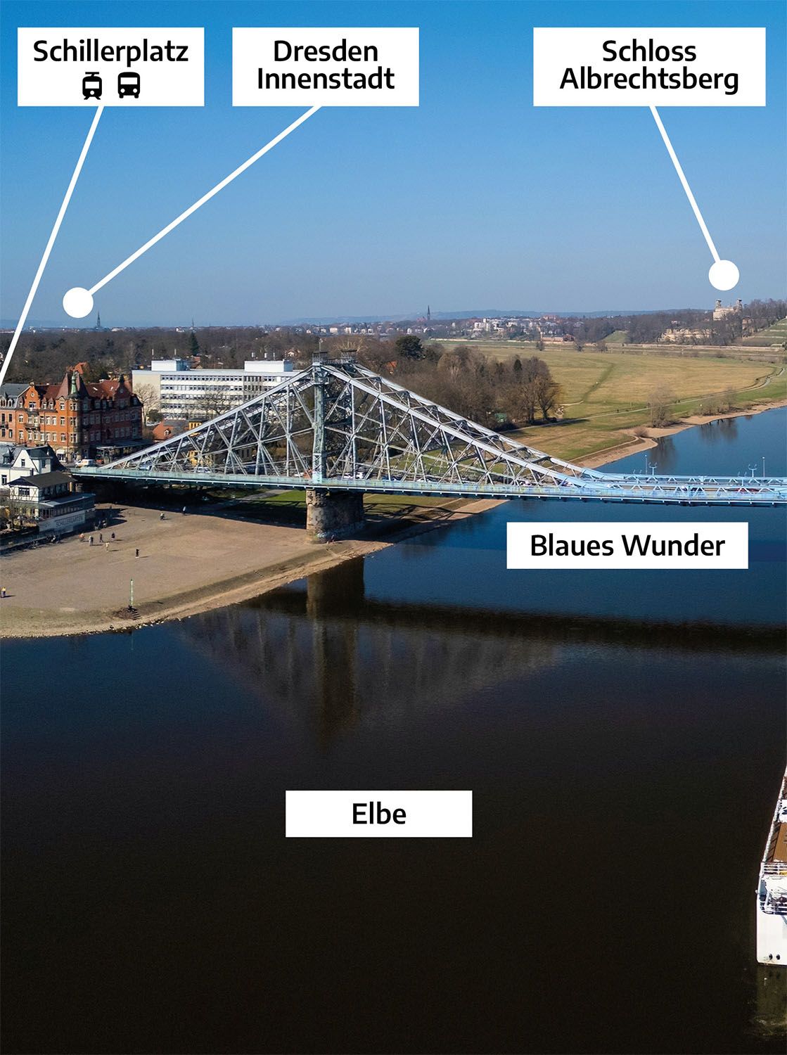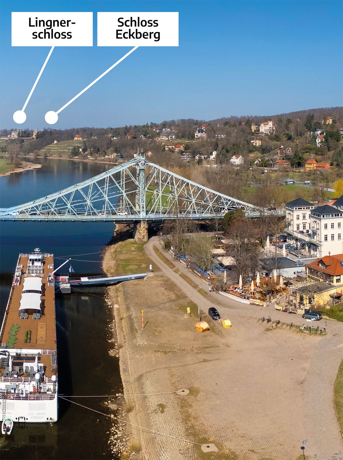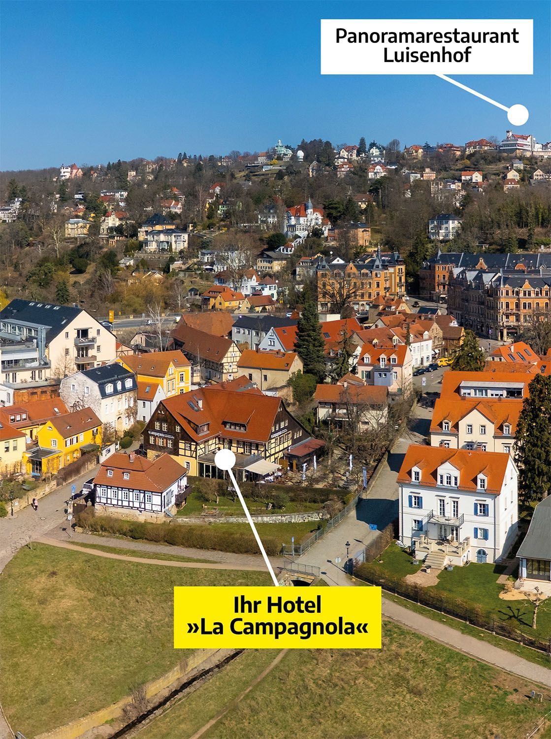 Ein Highlight ist die historische Standseilbahn, die die Gäste zum Luisenhof bringt. Von dort aus hat man einen der besten Ausblicke auf unser Hotel, das Blaue Wunder, die charmanten Villen von Loschwitz und die weitläufigen Elbwiesen.