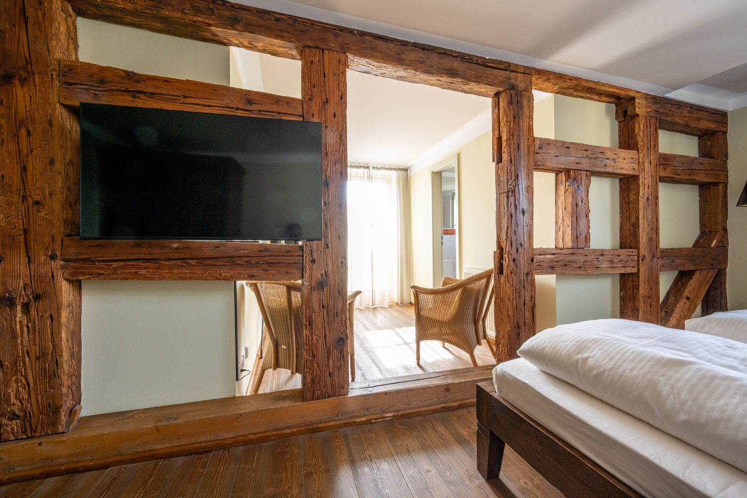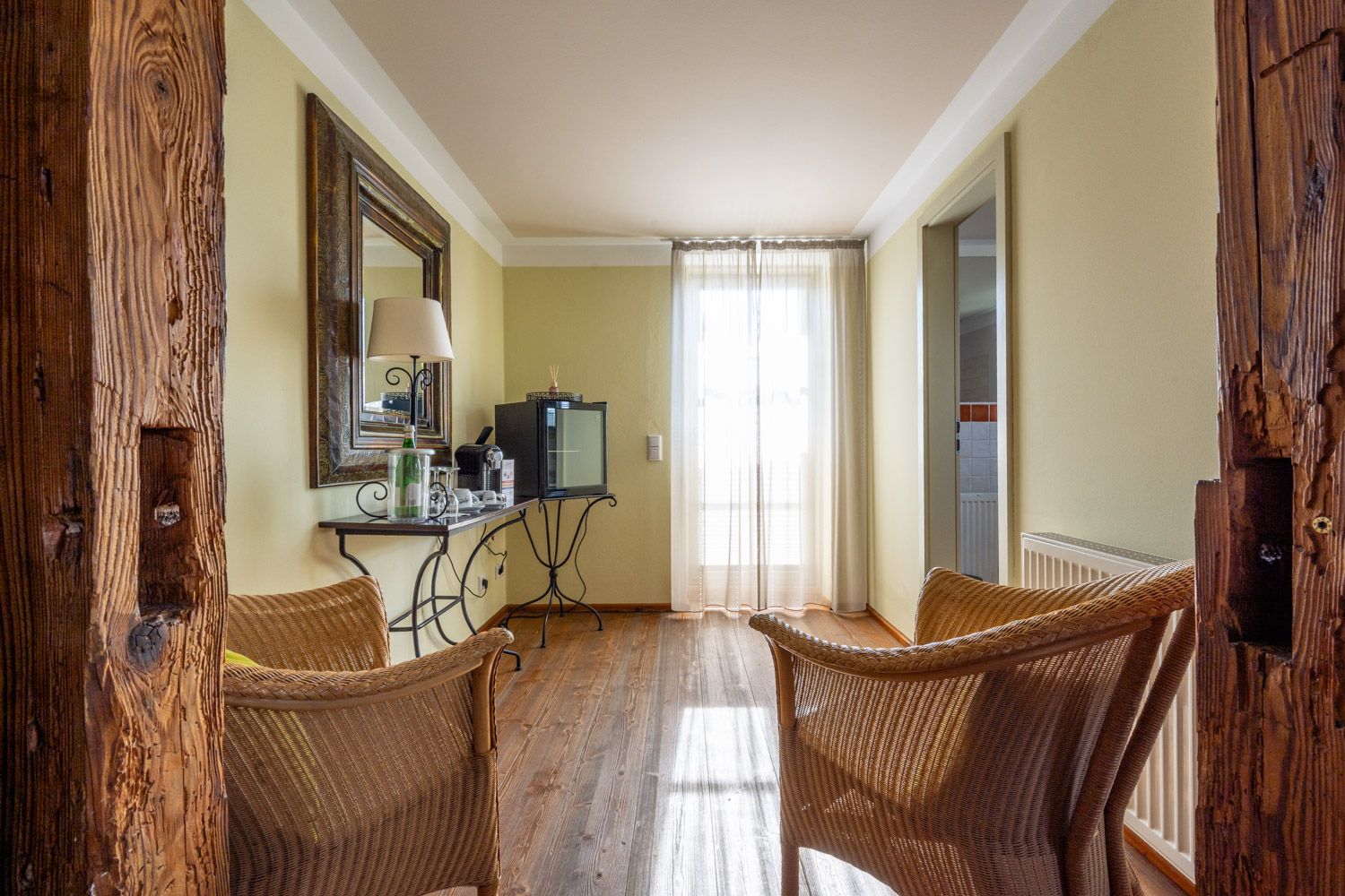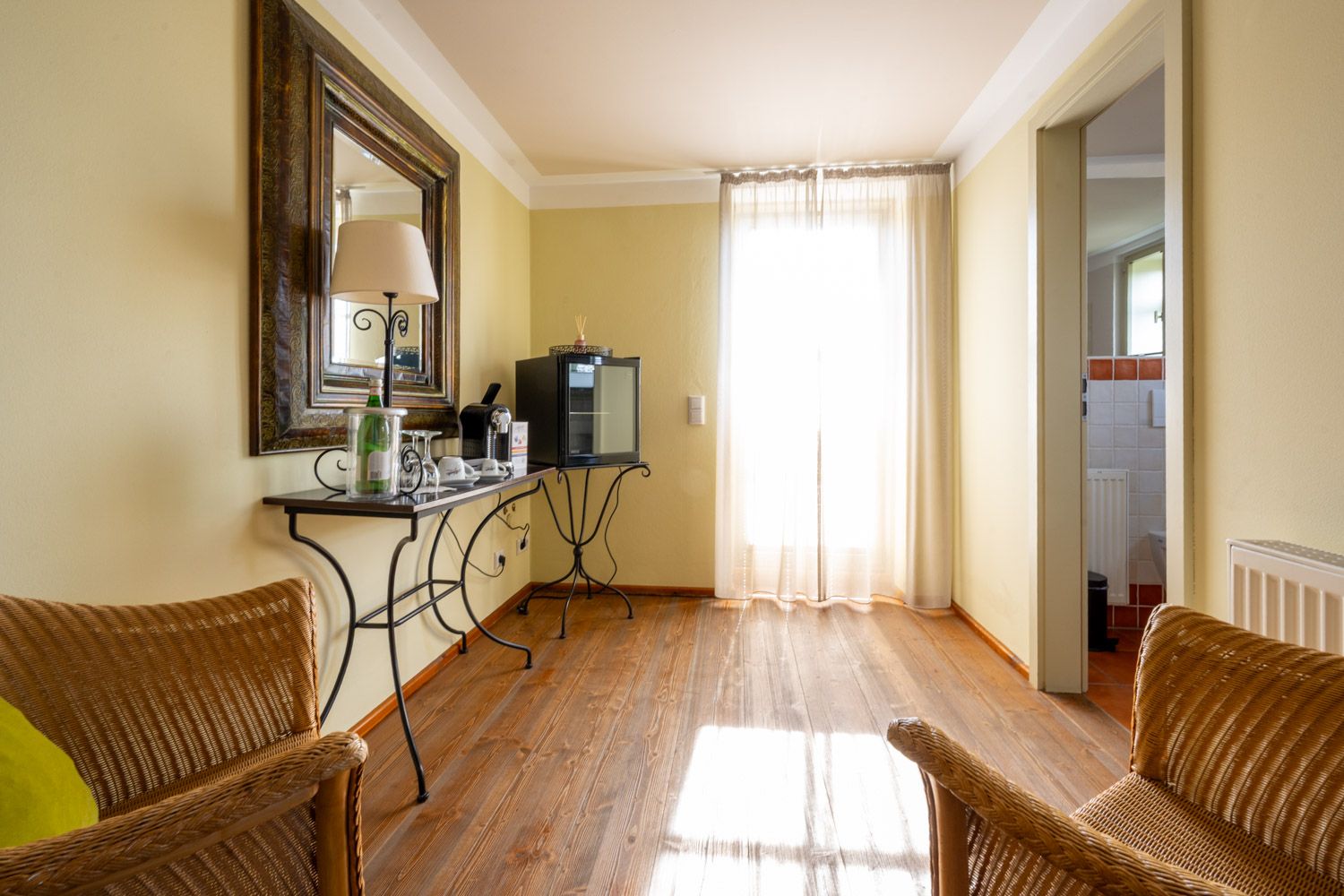 Im historischen Fährgut stehen zwei großzügige Doppelzimmer als gemeinsame Einheit zur Verfügung, die sich ideal als Familienzimmer für bis zu sechs Personen eignen. Beide Zimmer liegen im 1. Obergeschoss, verfügen jeweils über ein eigenes Bad mit Badewanne und Dusche, gemütliche Sitzmöglichkeiten sowie Ausstattungen wie Flachbild-TV, Minibar und Kaffee- bzw. Teestation. Über die große, gemeinsame Sonnen-Terrasse genießen Sie den freien Blick über die Elbe zum Blauen Wunder, den Elbwiesen und bis hin zum Fernsehturm – perfekt für Familien oder befreundete Paare, die viel Raum, Komfort und ein eigenes Refugium im historischen Alten Fährgut schätzen.